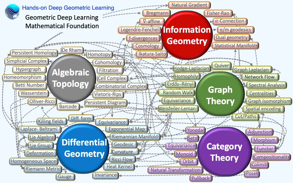 This article surveys key mathematical ideas and assumes no prior expertise—don’t expect formal theorems or formulas. It distills the math specific to geometric deep learning from a sample of papers published between 2022 and 2024. The five-category breakdown (sections) is a pragmatic (and somewhat arbitrary) organizing choice. This article encompasses more topics than the strict mathematical foundation of GDL [ref 5].