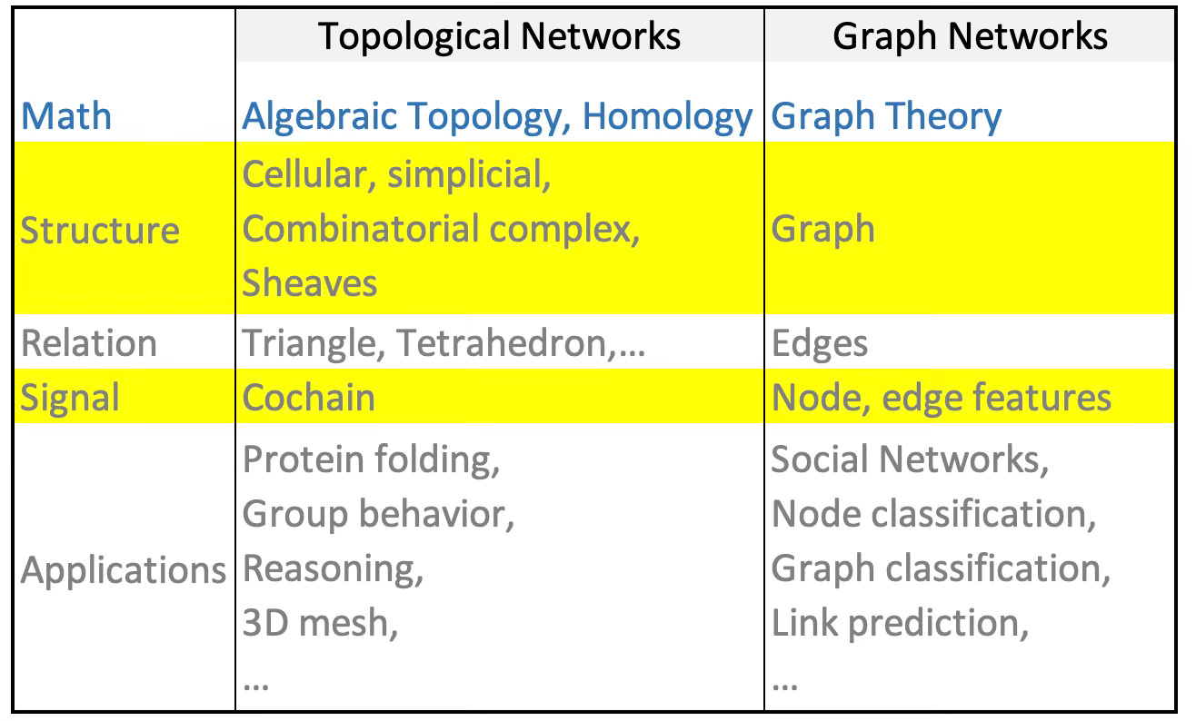 ✅ Topological Neural Networks extend Graph Neural Networks by adding topological structure (e.g., complexes) and signals to the list of existing features and adapting message-passing and aggregation scheme.