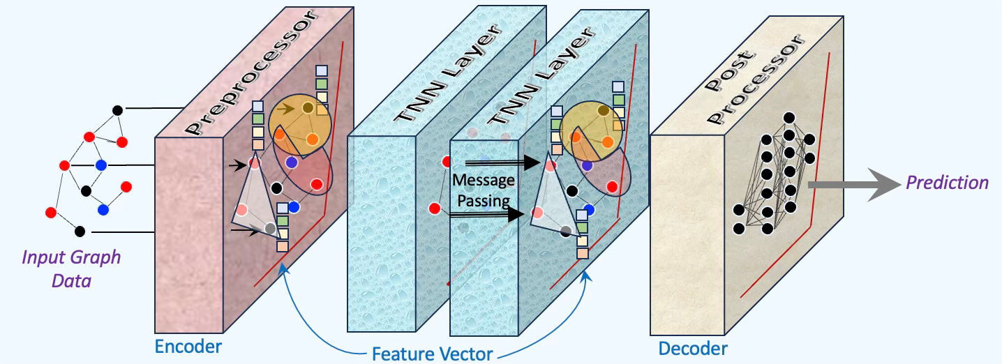 Fig. 4. Illustration of Pre/Post Processing, Neural Layers and Message Passing for Graph Neural Networks