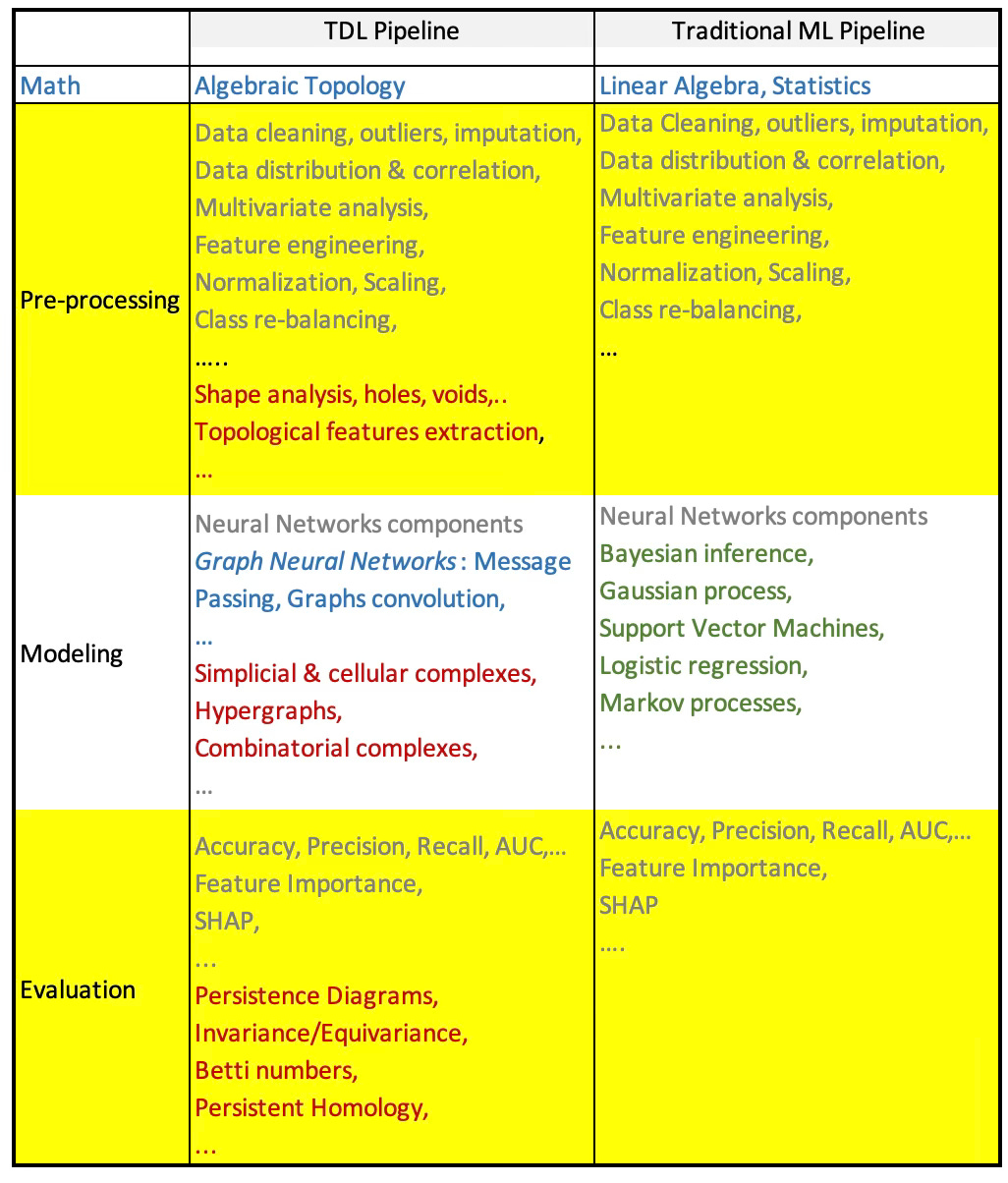 The following comparison tables illustrates the difference between traditional machine learning pipeline and TDL pipeline.