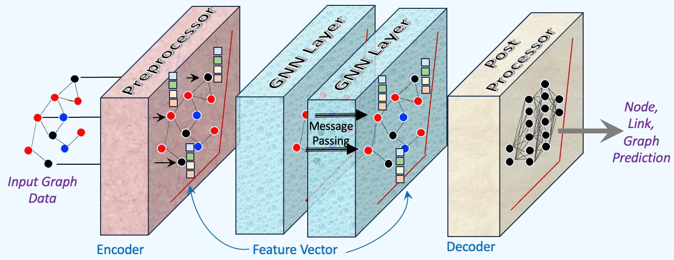 Post-processing layers: Feedforward layers decoding the output of the Message passing layers and predict node, link or graph.