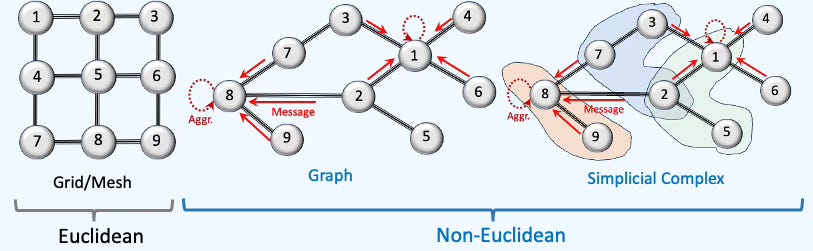 The core focus lies on simplicial, combinatorial, and cell complexes, culminating in hypergraphs as expressive tools for modeling higher-order interactions. These structures provide a natural extension to GNNs, complementing message-passing and pooling operations with geometric symmetries, invariance, and equivariance.