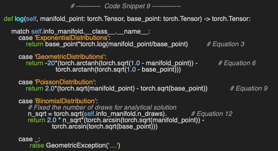 📌 I limit this evaluation to four families of distributions: Exponential, Poisson, Binomial, and Geometric. Several other distributions, like the Bernoulli, also admit closed-form expressions for the exponential and logarithm maps.