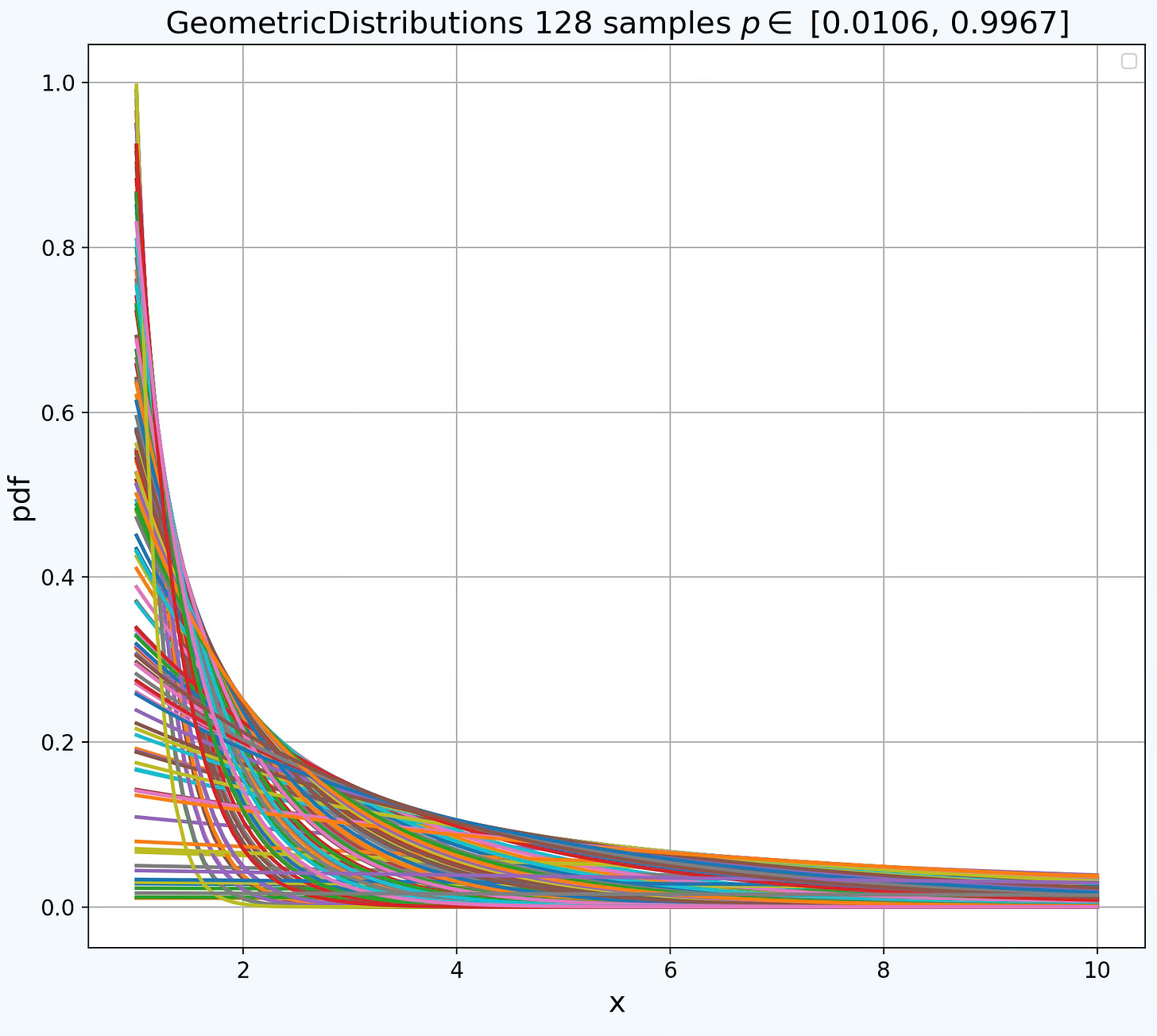 Fig. 3 Family of Geometric Distributions with random samples of the probability of success p