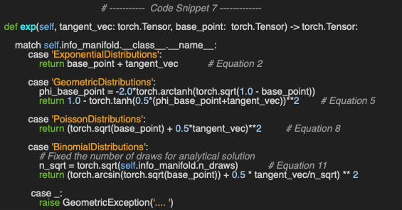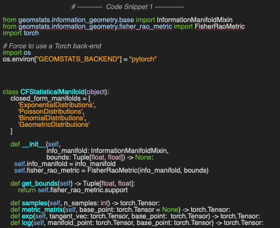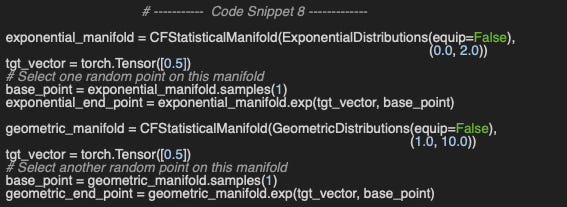 Let’s create a class, CFStatisticalManifold to encapsulates the various operations on the statistical manifolds with closed-form for exponential and logarithm map (Code snippet 1).
