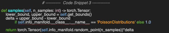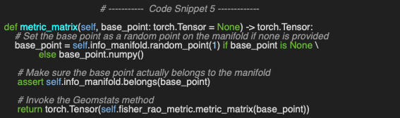 As discussed in a previous article on Riemannian manifolds like the hypersphere, this evaluation depends on the framework’s ability to generate random data points on statistical manifolds, as illustrated in Code snippet 3.