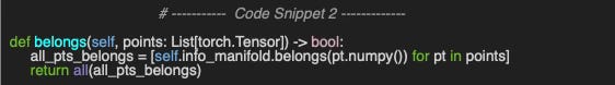The method belongs (Code snippet 2) checks whether each point lies on the manifold by calling the corresponding belongs method from Geomstats.