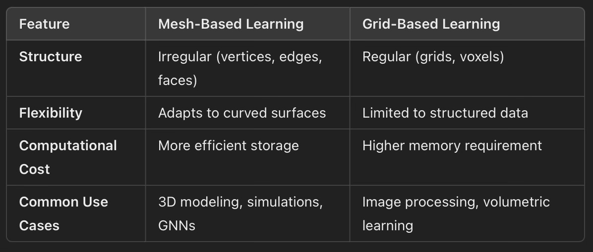 A mesh is a collection of vertices, edges, and faces that define the shape of a 3D object. Mesh-based learning focuses on directly processing these structures. A grid represents data in a structured, regular manner, such as a 2D/3D pixel or voxel grid.