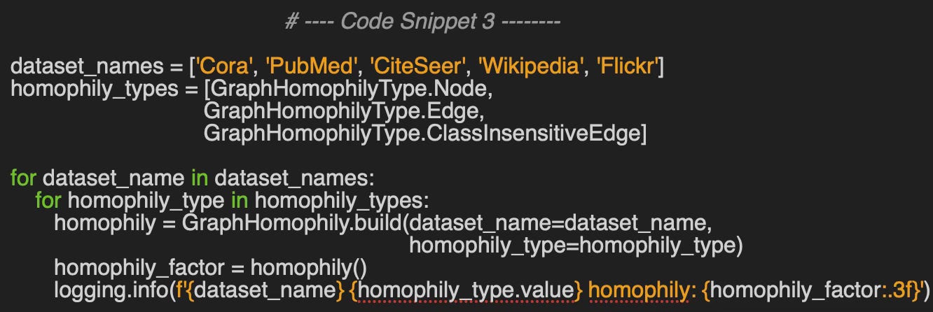 The GraphHomophily class, shown in code snippet 1, encapsulates the computation of node homophily, edge homophily, and class-insensitive edge homophily. It provides two constructors: