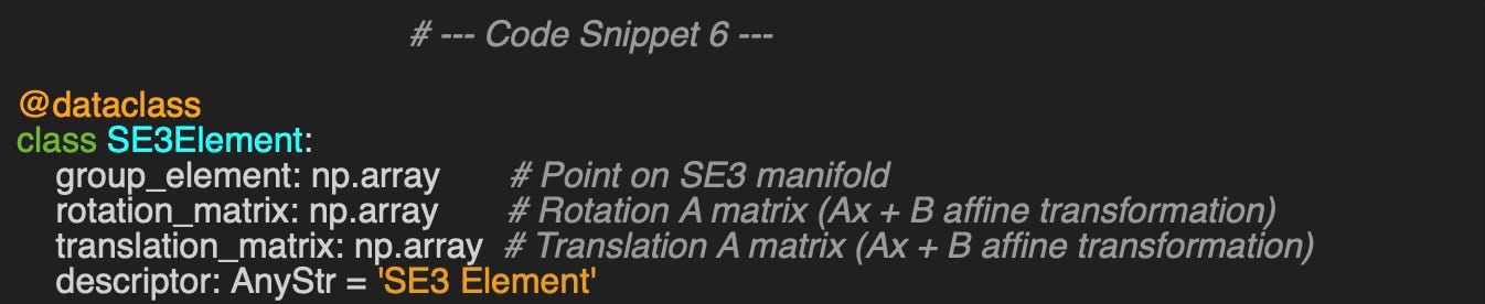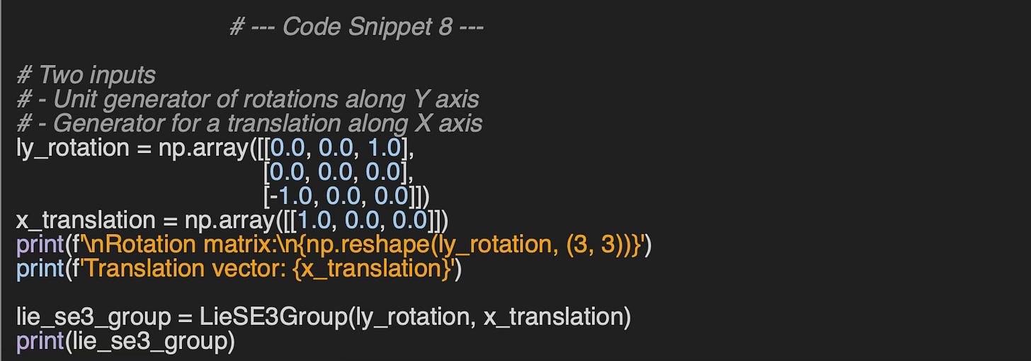 For the sake of convenience, we wrap the creation and manipulation of elements of the SE(3) into a class LieSE3Group with two constructors: