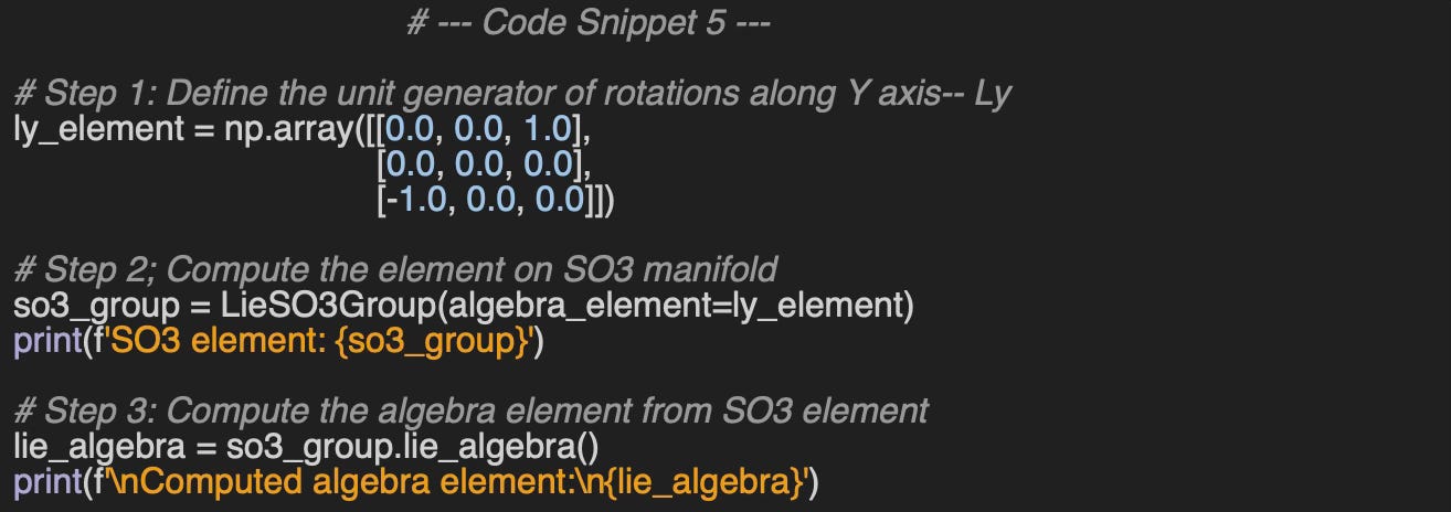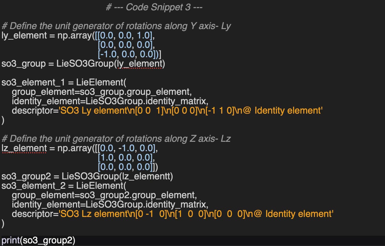⚠️ A thorough tutorial and explanation of Lie groups, Lie algebras, and geometric priors for deep learning models is beyond the scope of this article. Instead, the following sections concentrate on experiments involving key elements and operations on Lie groups using the Geomstats Python library.