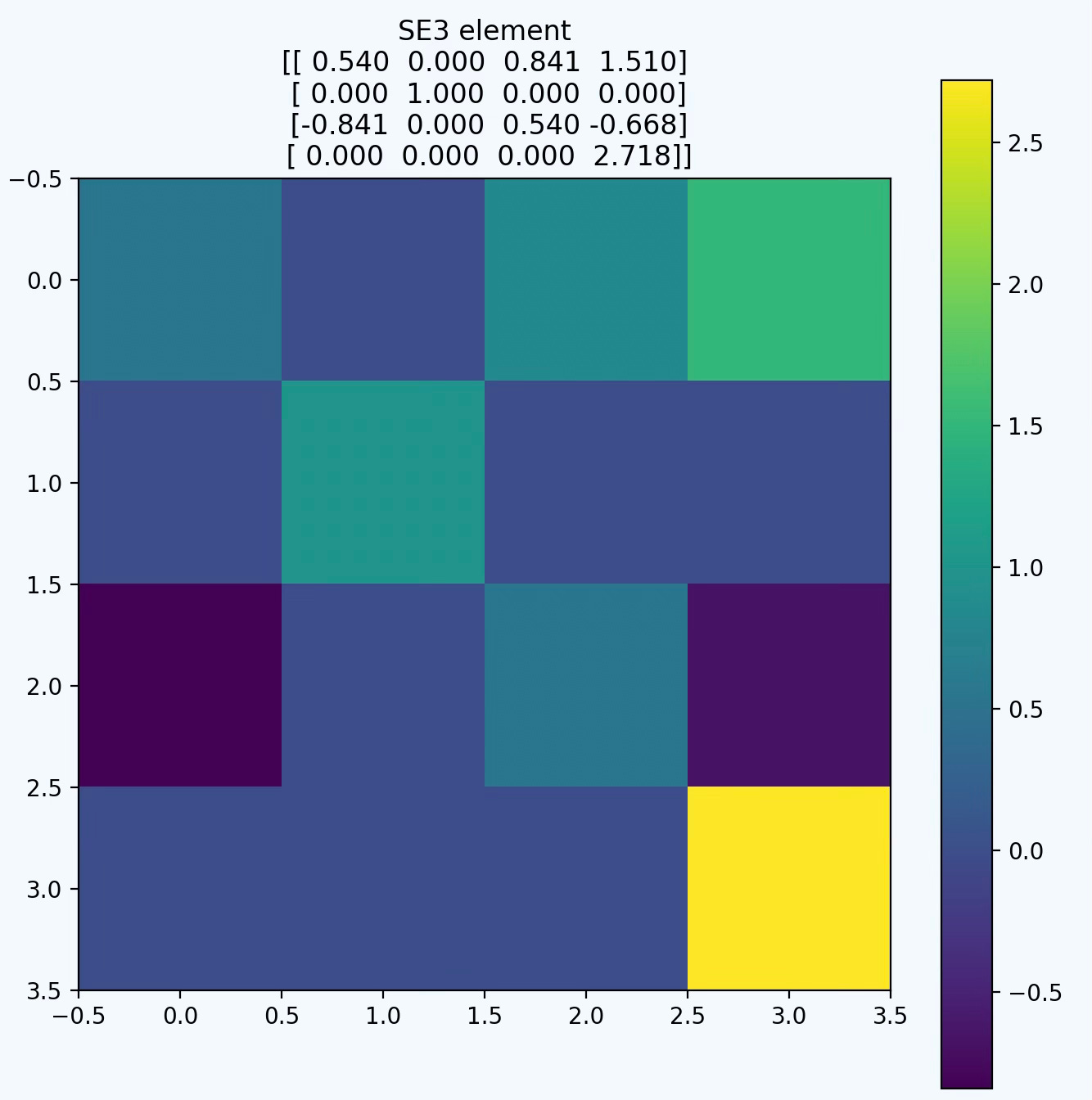 Fig. 6 HeatMap visualization of a SE3 element generated from a 90 degrees rotation along Y axis and a translation along X axis