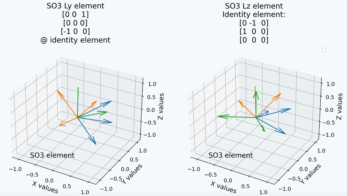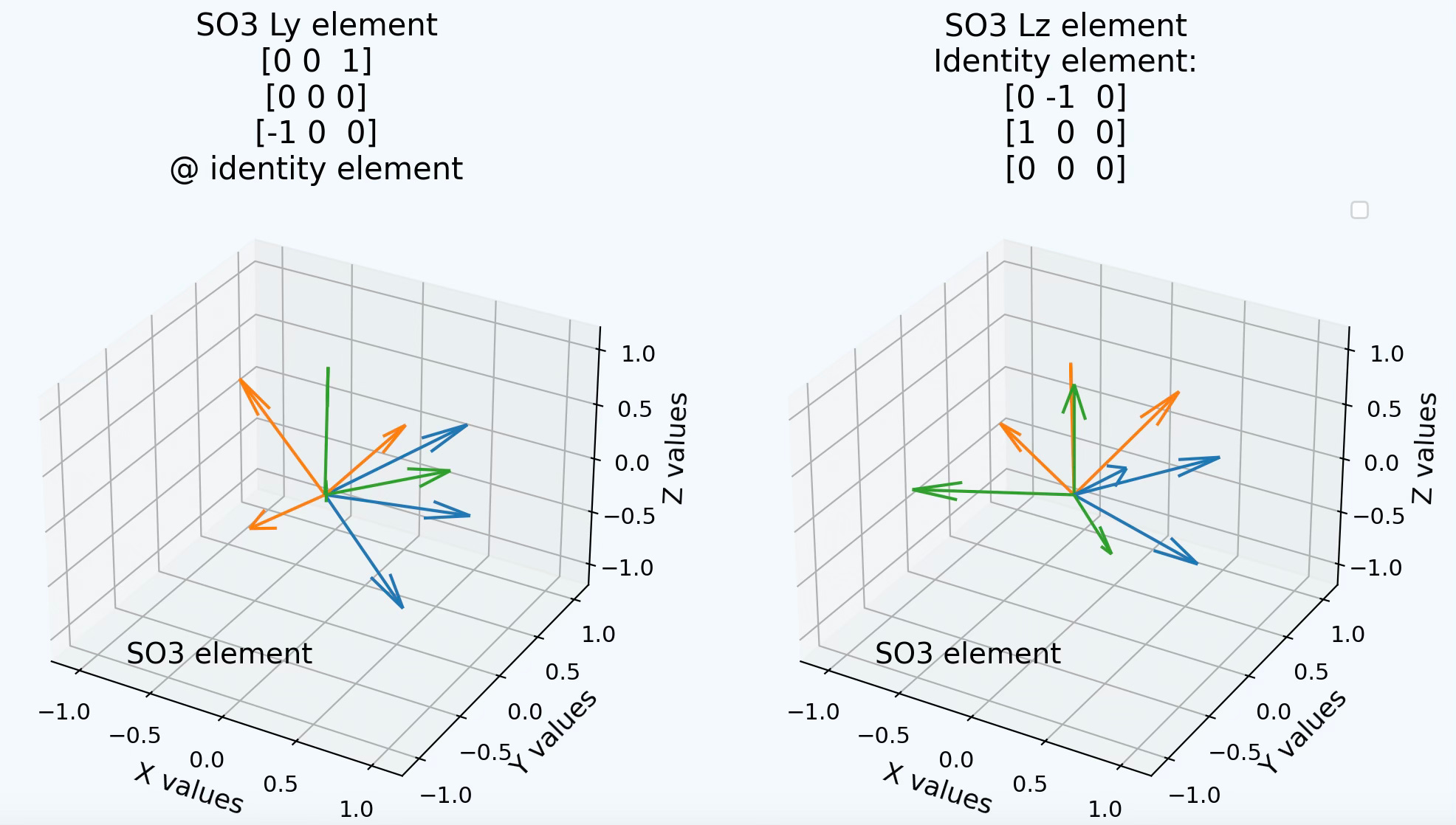 The first SO3 element uses the identity as the reference for a fundamental generator of rotations around Y axis: Ly= [[ 1. 0. 0.] [ 0. 0. -1.] [ 0. 0. 0.]]