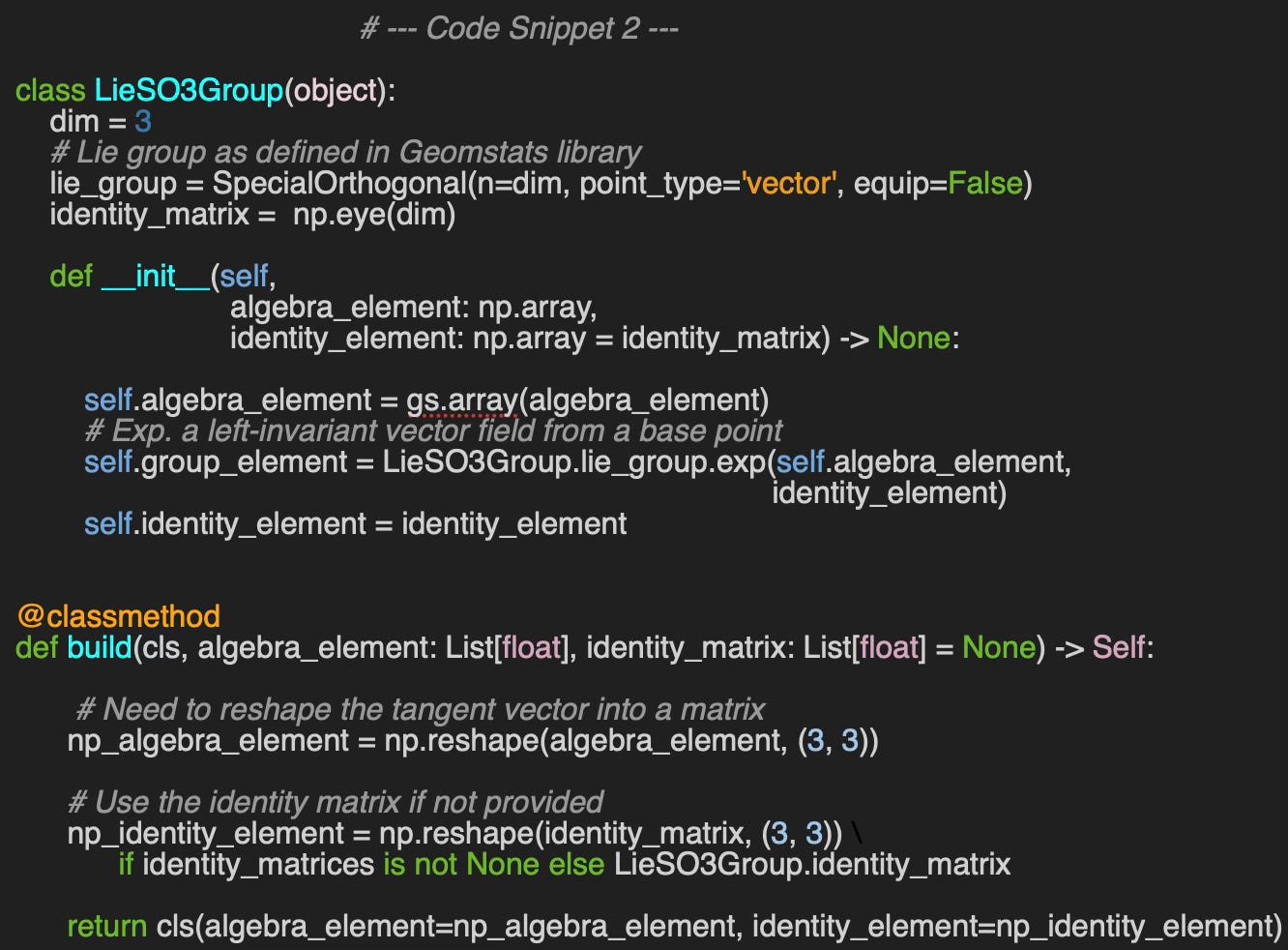 Next we wrap the creation and manipulation of elements of the SO(3) into a class LieSO3Group with two constructors: