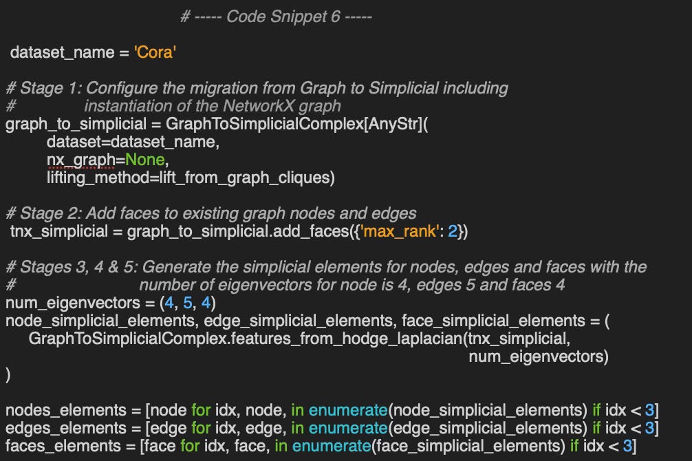 We now have what we need to generate the simplicial elements (nodes, edges, faces) via the GraphToSimplicialComplex class in three straightforward steps. The code snippet 6 implements the 5 stages described in the Modeling & Design Principle section.