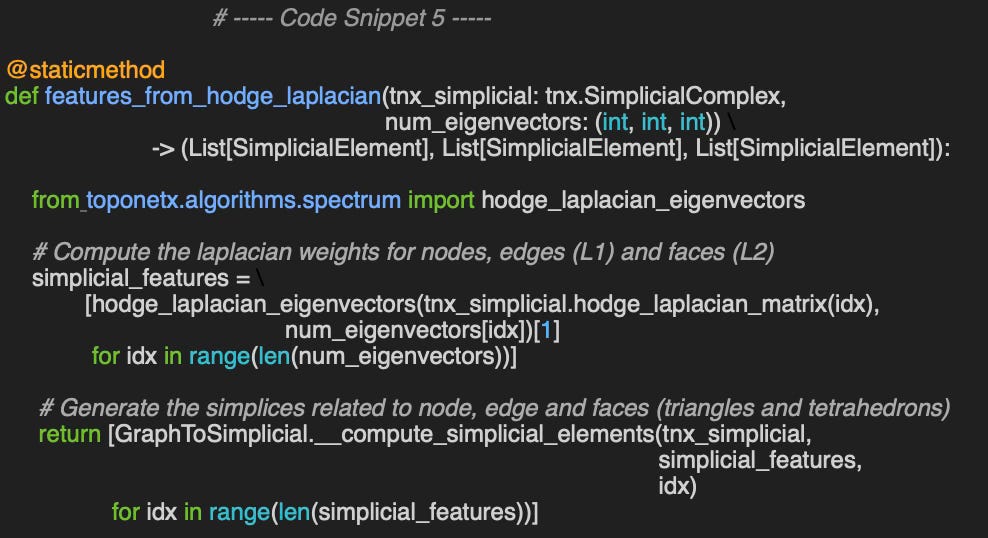 Let’s dig into the mathematical inner workings for extracting edge and face feature vector to generate simplicial complexes. The procedures relies on the extraction of incidence matrices and Hodge Laplacian [ref 5].