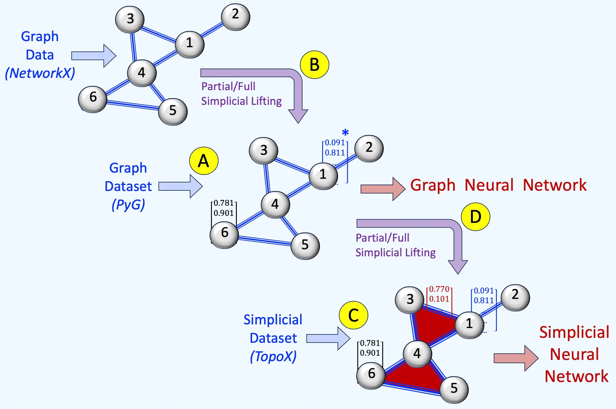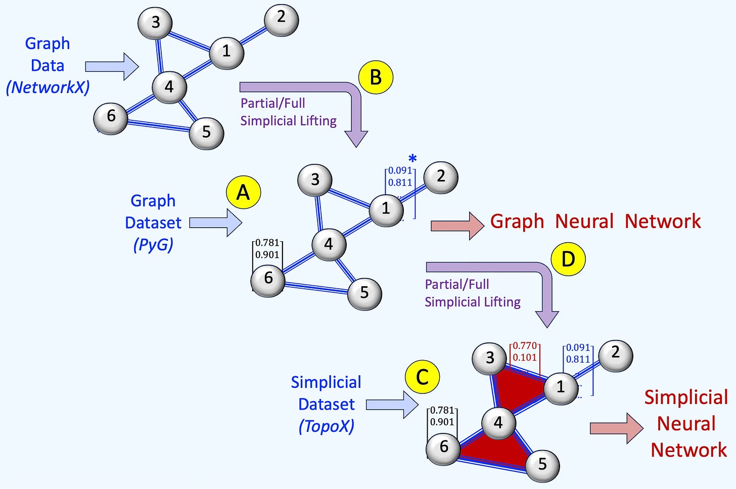 One key benefit of this approach is that can be fully automated and leverage existing Python libraries; NetworkX, PyTorch Geometric (PyG) and TopoX. These libraries have been described in previous articles [ref 1, 2, 3].