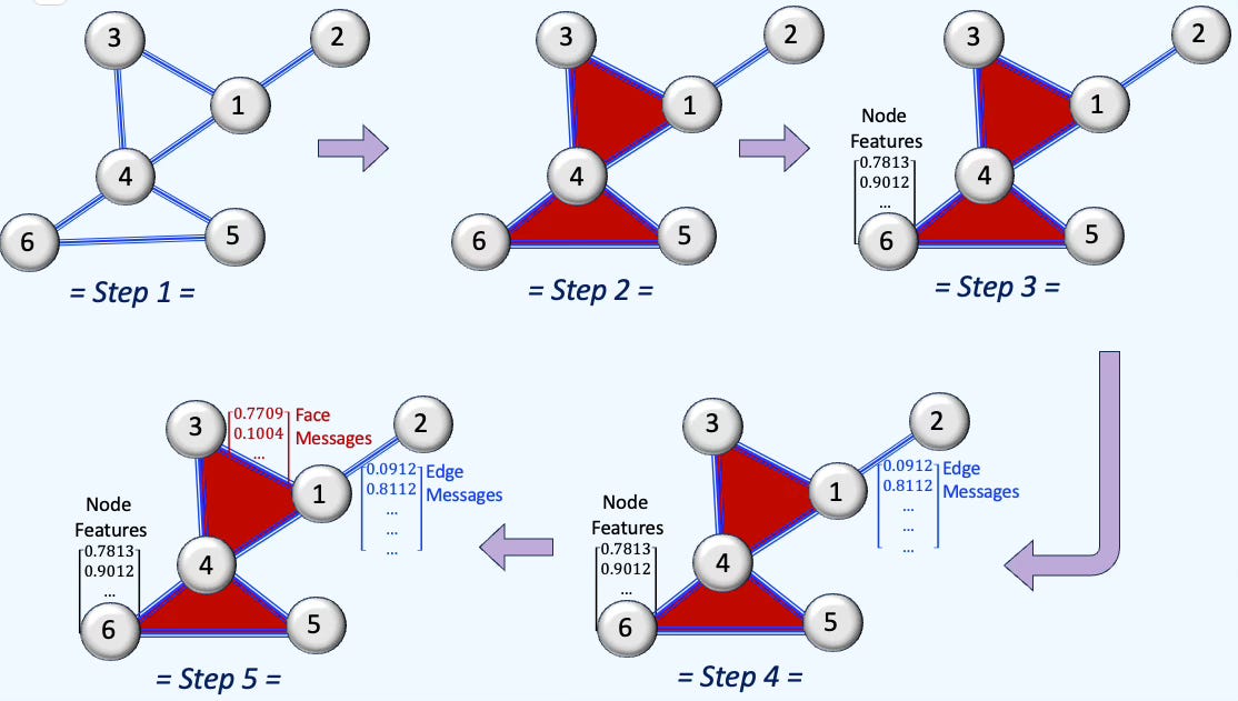 There are few fully specified simplicial-complex datasets for exploring these topological methods and assessing their impact on prediction and classification. One practical approach is to derive faces (triangles) from an existing graph and then compute feature vectors for nodes, edges, and faces from the graph’s geometry.
