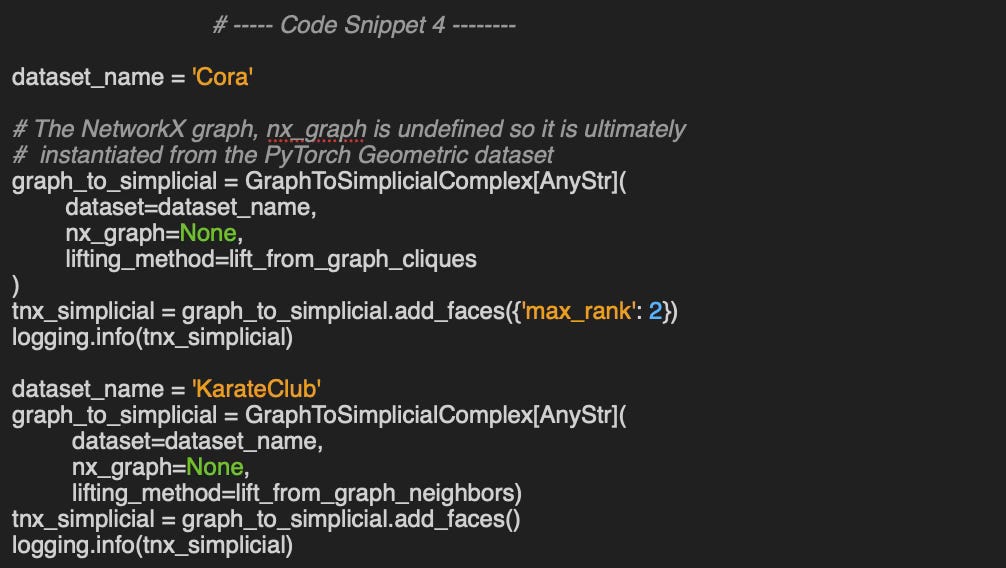 Let’s add faces (max_rank=2) to Cora and KarateClub PyTorch Geometric graph data as illustrated in the code snippet 4. We select a different lifting methods for each of the data set invoked through its name.
