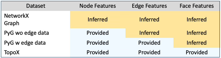 The table below summarizes how to infer node, edge, and face features when they aren’t provided by the PyTorch Geometric or TopoX datasets.